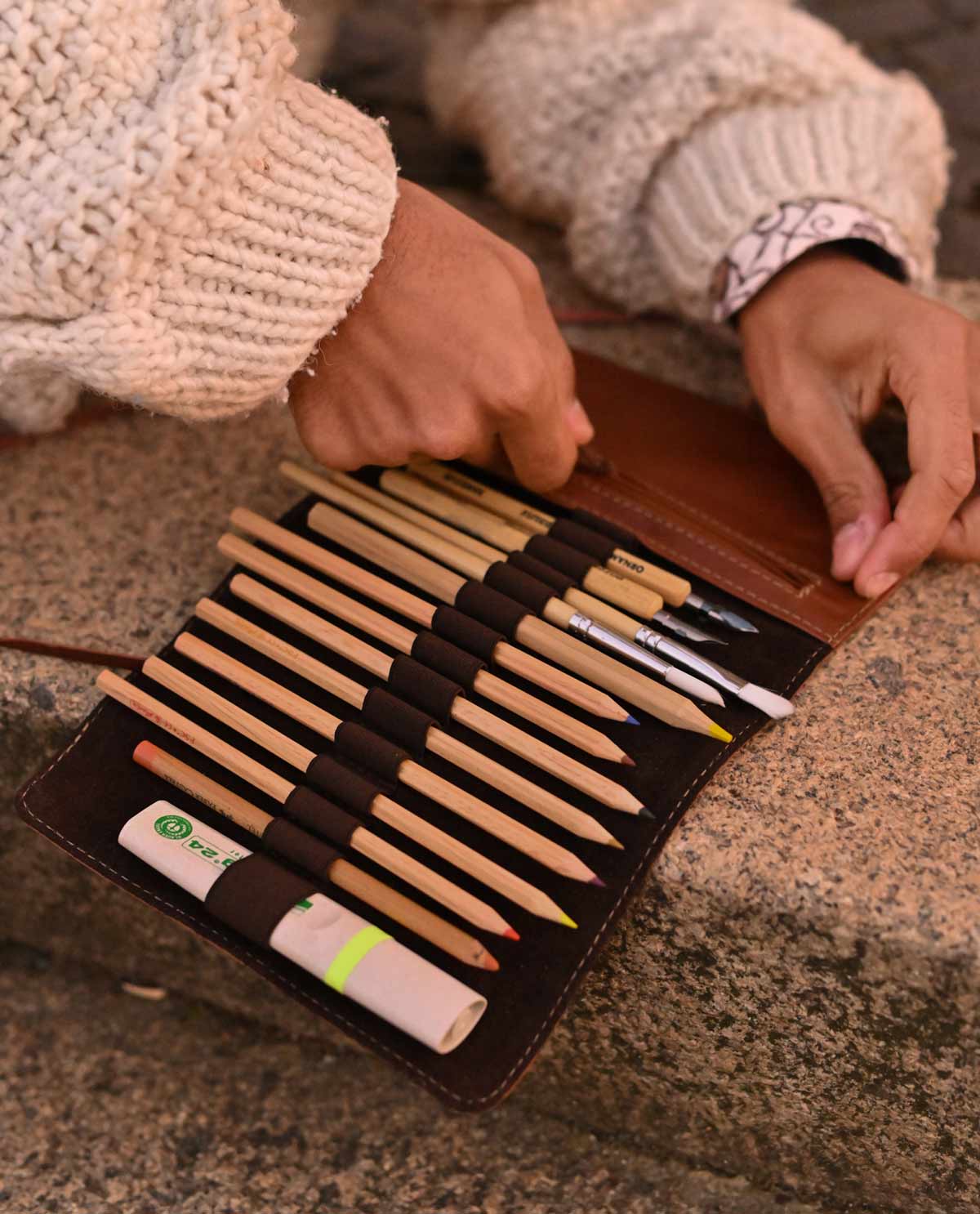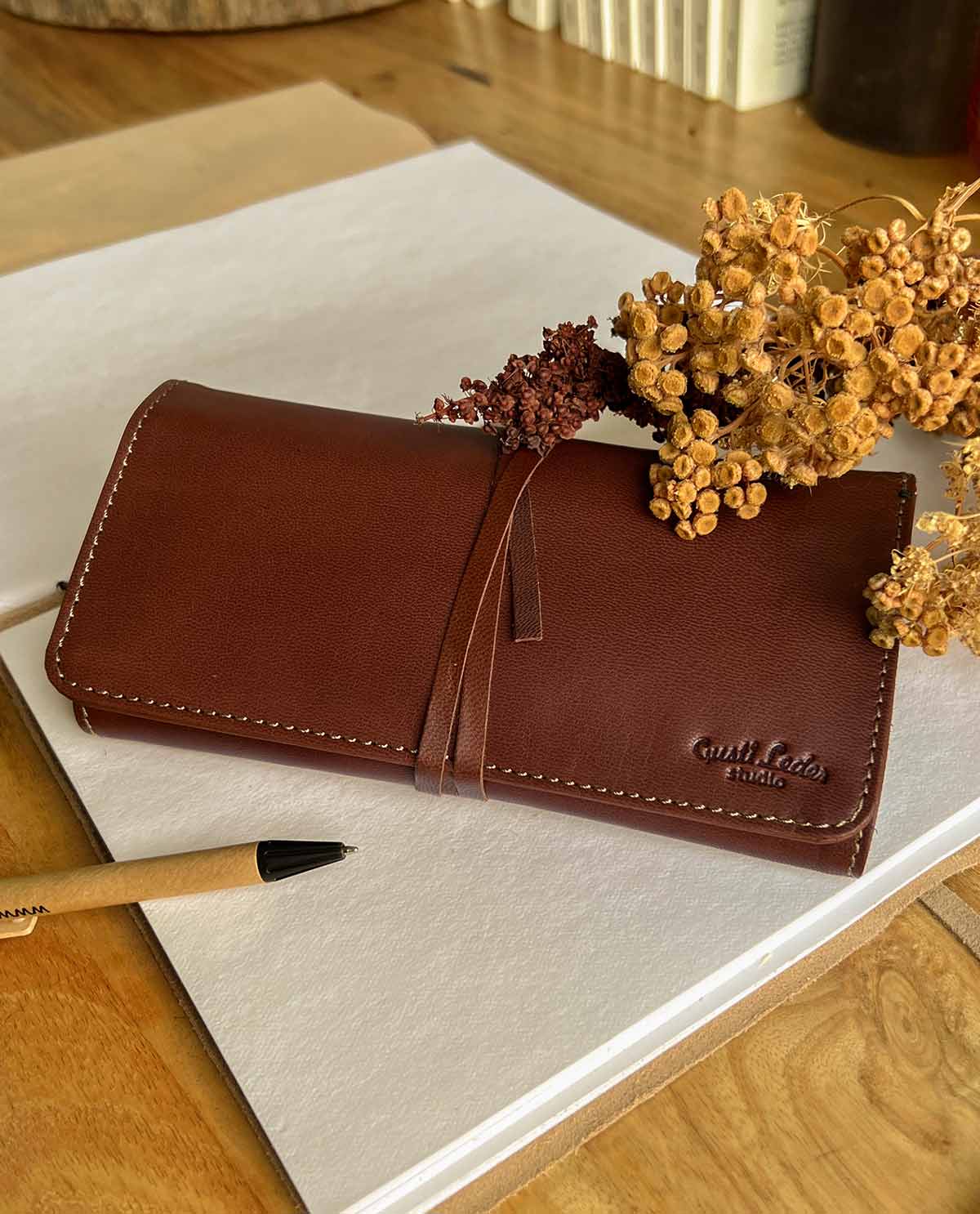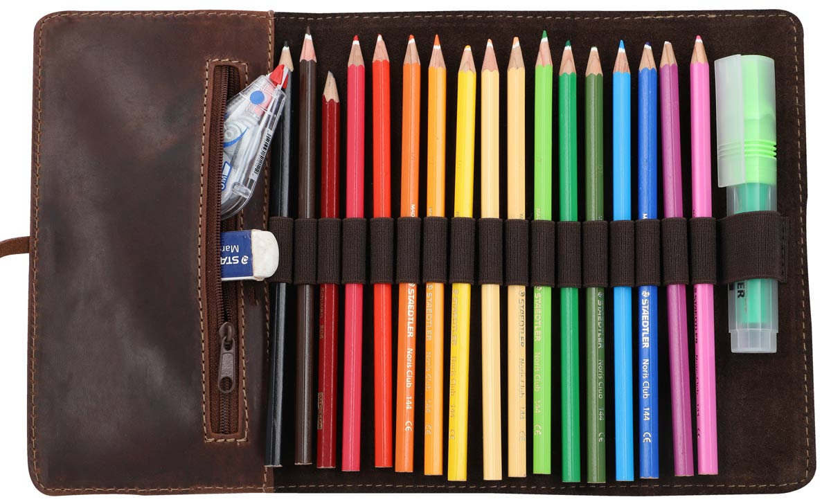 This slim pencil case is the perfect place to keep all of your pens in one place and fits neatly into any bag. The high-quality cowhide leather used to create “Casper” gives this pencil case the shape and stability it needs to keep your pens, Tippex, rubbers, and more safe and sound. There’s a secret zipped pocket on the side where you can keep your essentials. “Casper” is secured by a leather wrap-around band that makes sure your things don’t get lost when you’re on the go.
