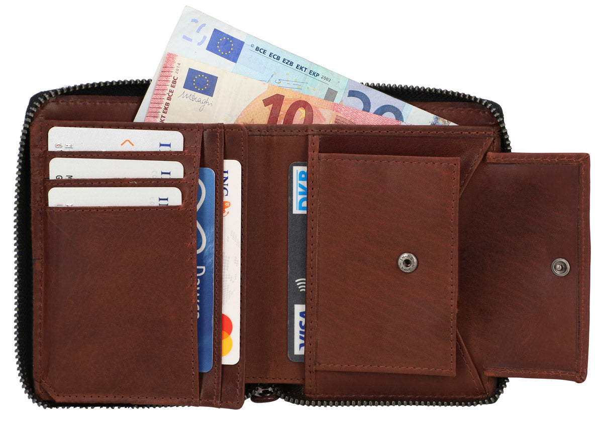 “Darian” is super organised; he has a large note pocket, a separate coin pocket secured with a press button, and three deeper slots. This high-quality tanned cowhide leather wallet will win you over with its compact size, stability, and soft feel. “Darian’s” design is completed by a sleek zip. So, you won’t lose anything when you’re on the go.