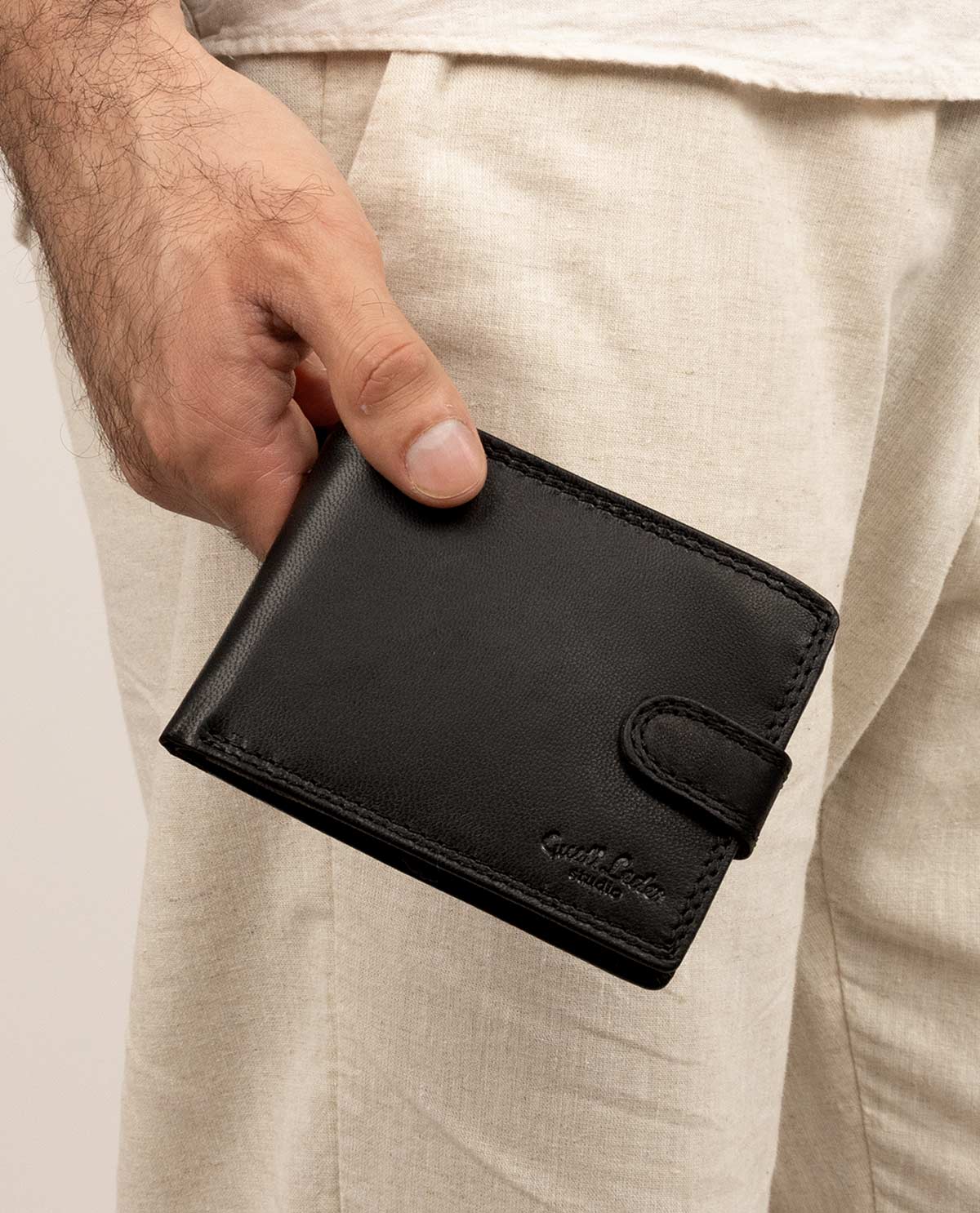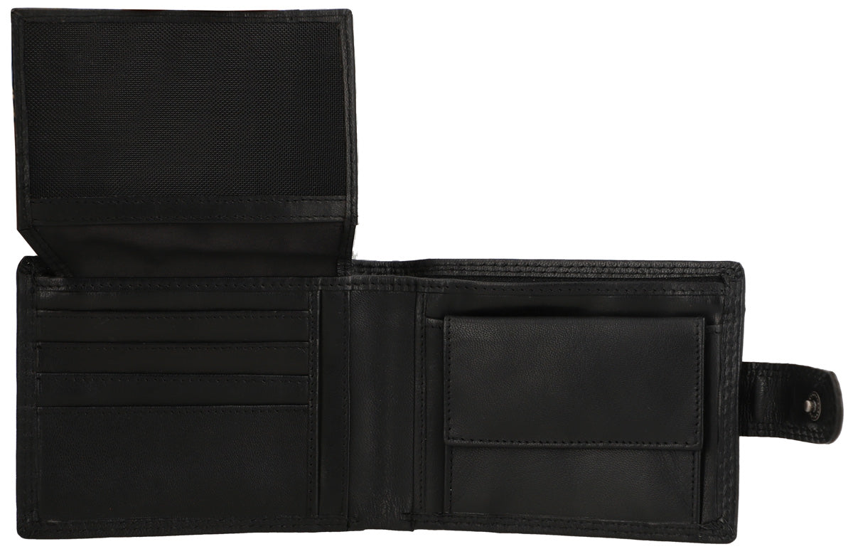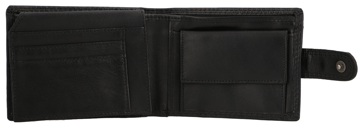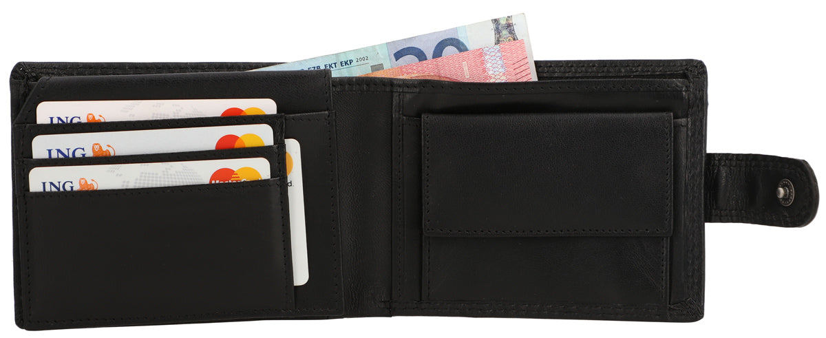 Inside, you are offered maximum comfort in functionality. The clever organization system helps you have your most important cards, IDs, coins, and bills quickly and easily at hand. Where at first glance there doesn’t seem to be much space, there is more than you think. Folding techniques and compartments allow you to store everything you imagine. A window with dimensions of 10.5 x 6.5 cm allows you, for example, to show your monthly pass without having to take it out first. The buffalo leather is high-quality processed and extremely robust. It offers you and your wallet great shape stability and promises that you will enjoy this great product for a long time. A snap button connected with a tab closes the wallet simply and uncomplicatedly.