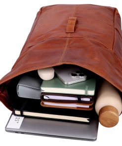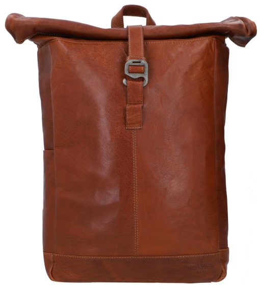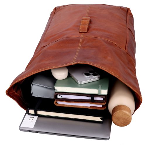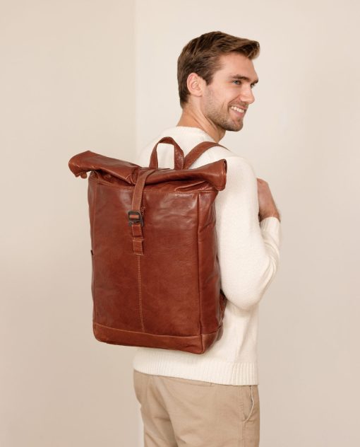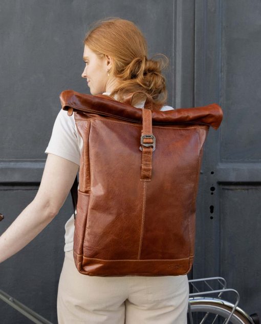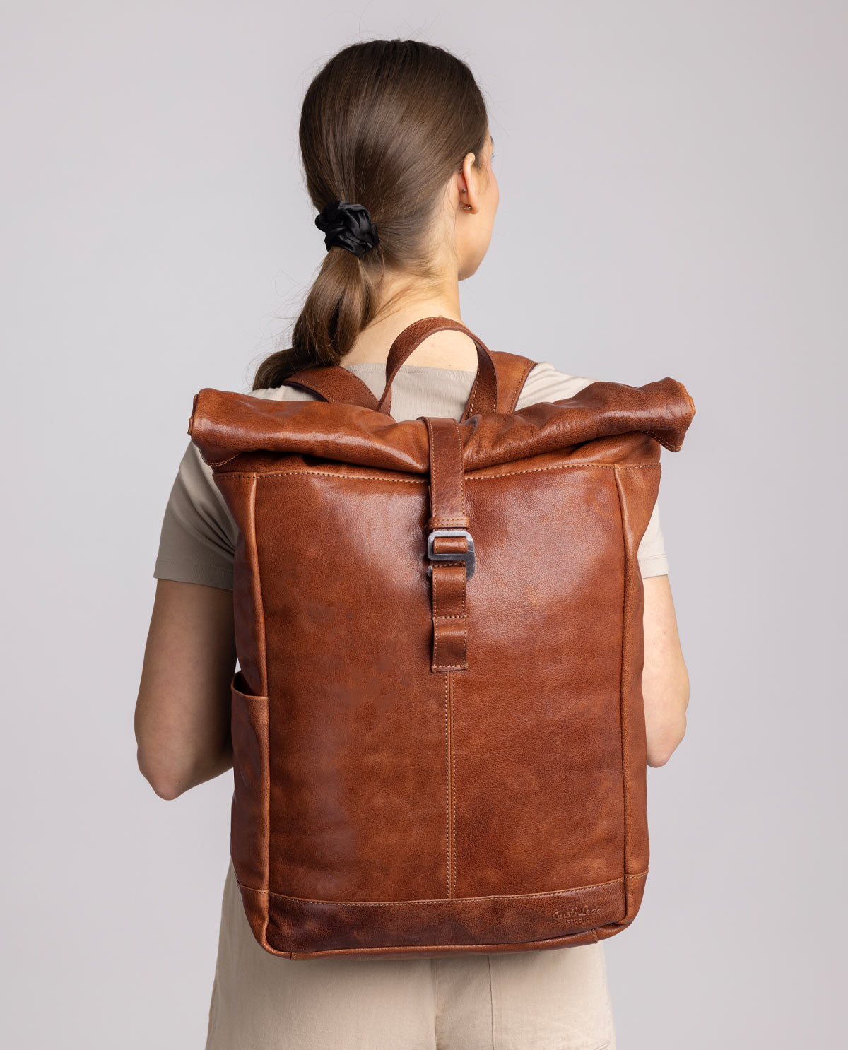 Our “Bendik” roll-top backpack is the perfect companion, no matter if you’re going to school, uni or work. He’ll win you over with his flexibility, comfort, and space. This sturdy, classic daypack made of brown leather stands out from the crowd with its trendy roll top – a look that you just can’t miss at the moment.