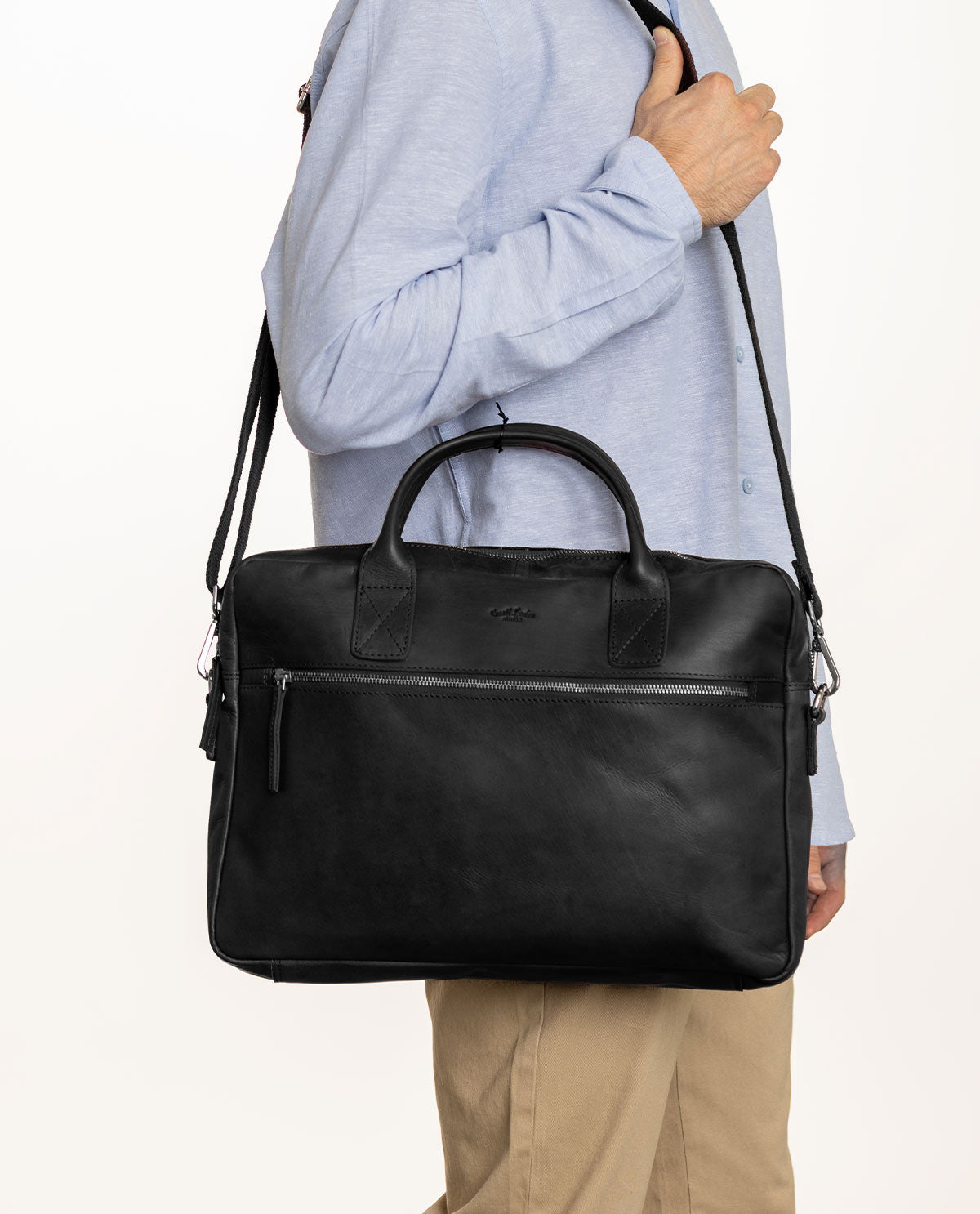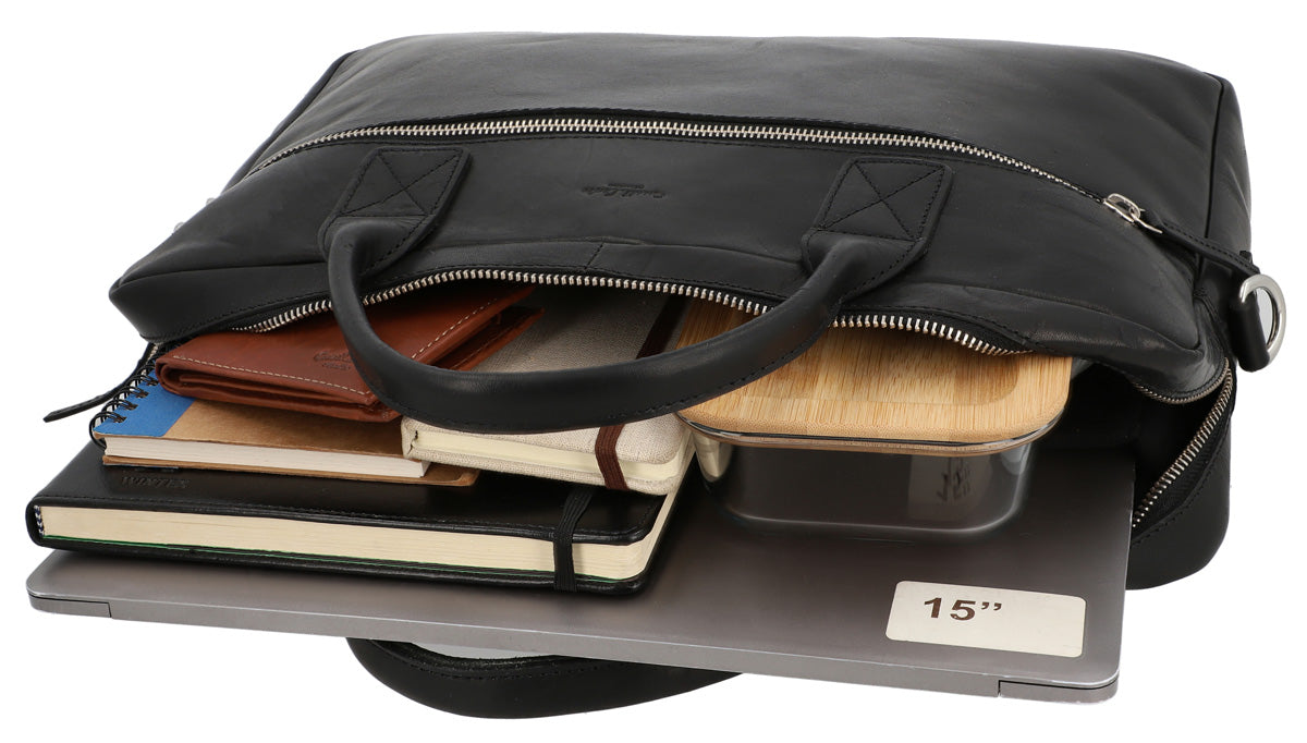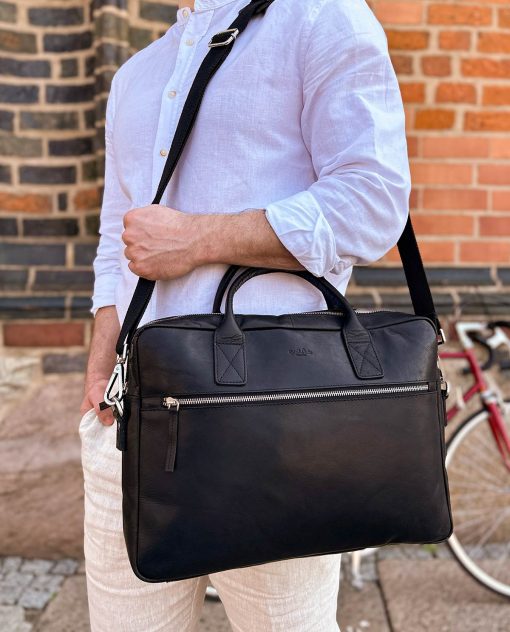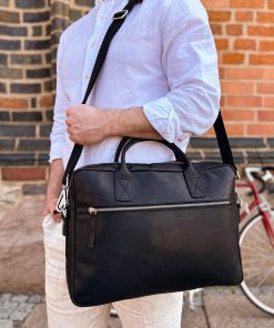 Are you looking for a modern bag for the office? Something high-quality and stylish? Then our black briefcase “Elijah” is exactly what you’ve been looking for. He’s made of high-quality cowhide leather and comes in a timeless elegant black design. There’s plenty of space for your important documents, laptop, tablet, folders, and more in this satchel.