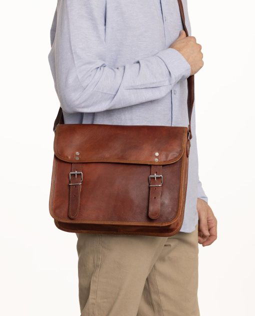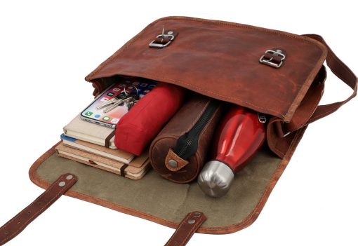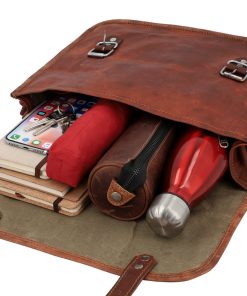 Are you looking for a stylish yet simple and spacious bag you can take to the office? Then our goatskin leather bag “John 11” is exactly what you’ve been looking for. Not too big and not too small—this satchel has plenty of space for your belongings. Your 11-inch laptop and A4 documents and folders can be stored in the spacious inner compartment easily. Keep your smaller items close by in the two slim inner compartments. Your belongings are secured by buckles that blend in with this bag’s vintage college vibe.