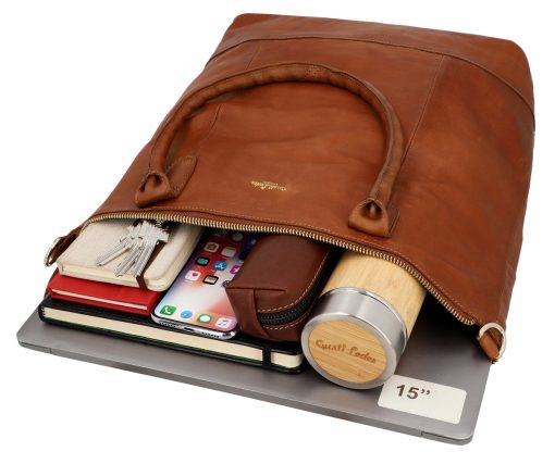 Made from high-quality tanned buffalo leather, this shoulder bag impresses with its sheer size and offers you versatility at the highest level. The extra-large interior compartment of “Mia” with a capacity of 10 liters provides enough space for your 15-inch laptop, wallet, small umbrella, various notebooks, keys, and pencil case. The large opening also gives you room for spontaneous purchases. An additional side pocket on the back is perfect for headphones or keys that you want to have quickly at hand.