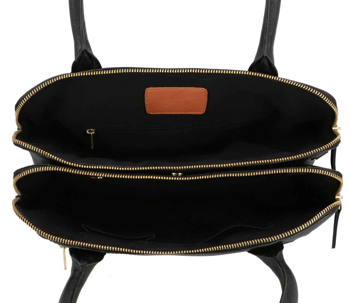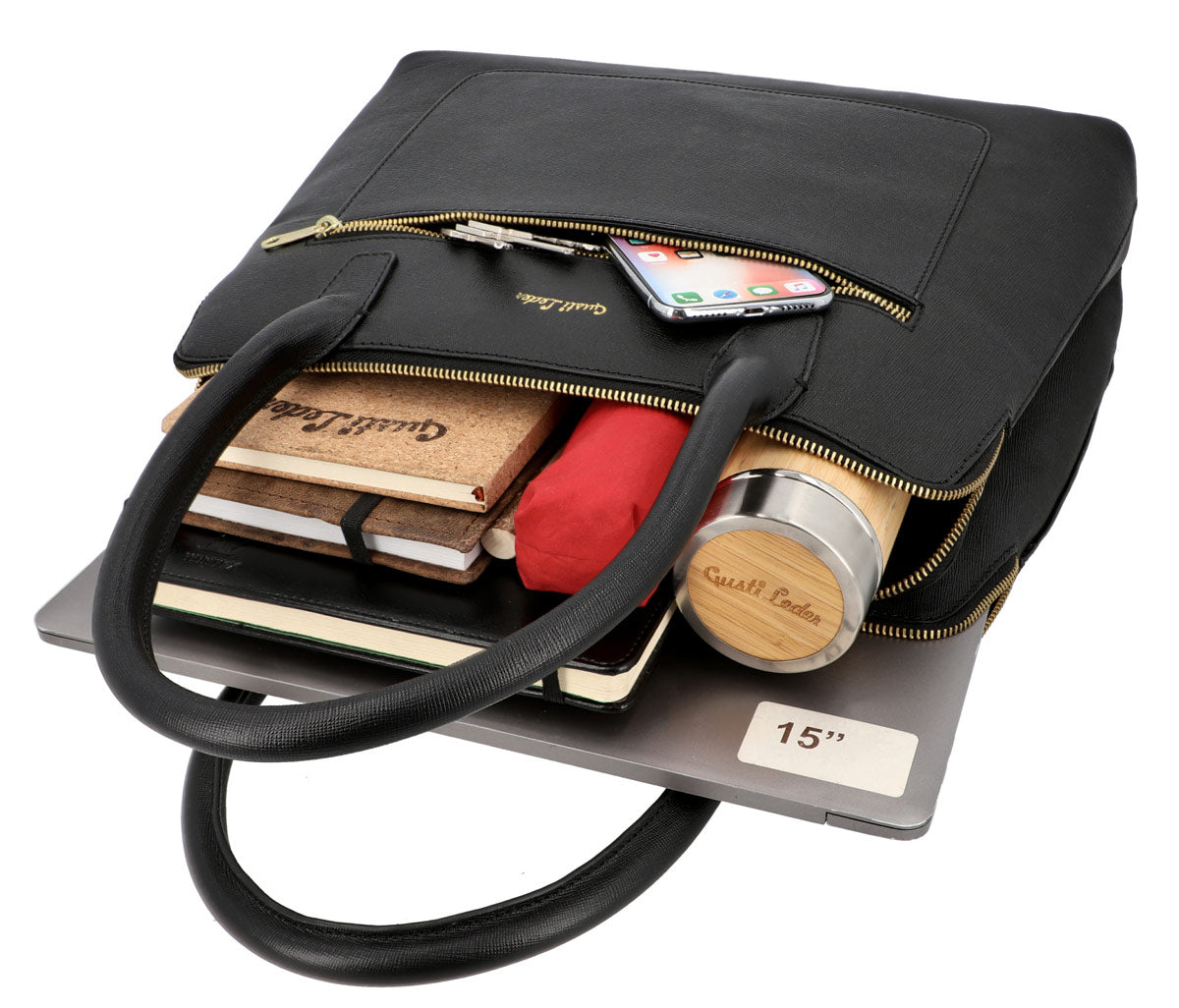 Made from high-quality tanned cowhide leather, “Marina” offers enough space for your iPad up to 9 inches, your wallet, water bottle, smartphone, and keys. Additionally, you can store all the small items you need on the go in one of the two insert pockets, such as your headphones. All pockets are equipped with zippers, so nothing can simply fall out. The golden metal accents and the Gusti logo complete the look of “Marina”. The simple and timeless Saffiano design gives “Marina” the perfect vintage flair!